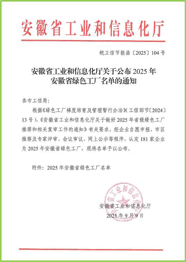 近日,安徽省工业和信息化厅正式公布2025年度省级绿色工厂认定名单,黄山恒久成功上榜。