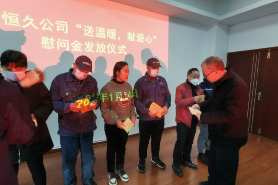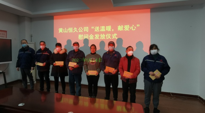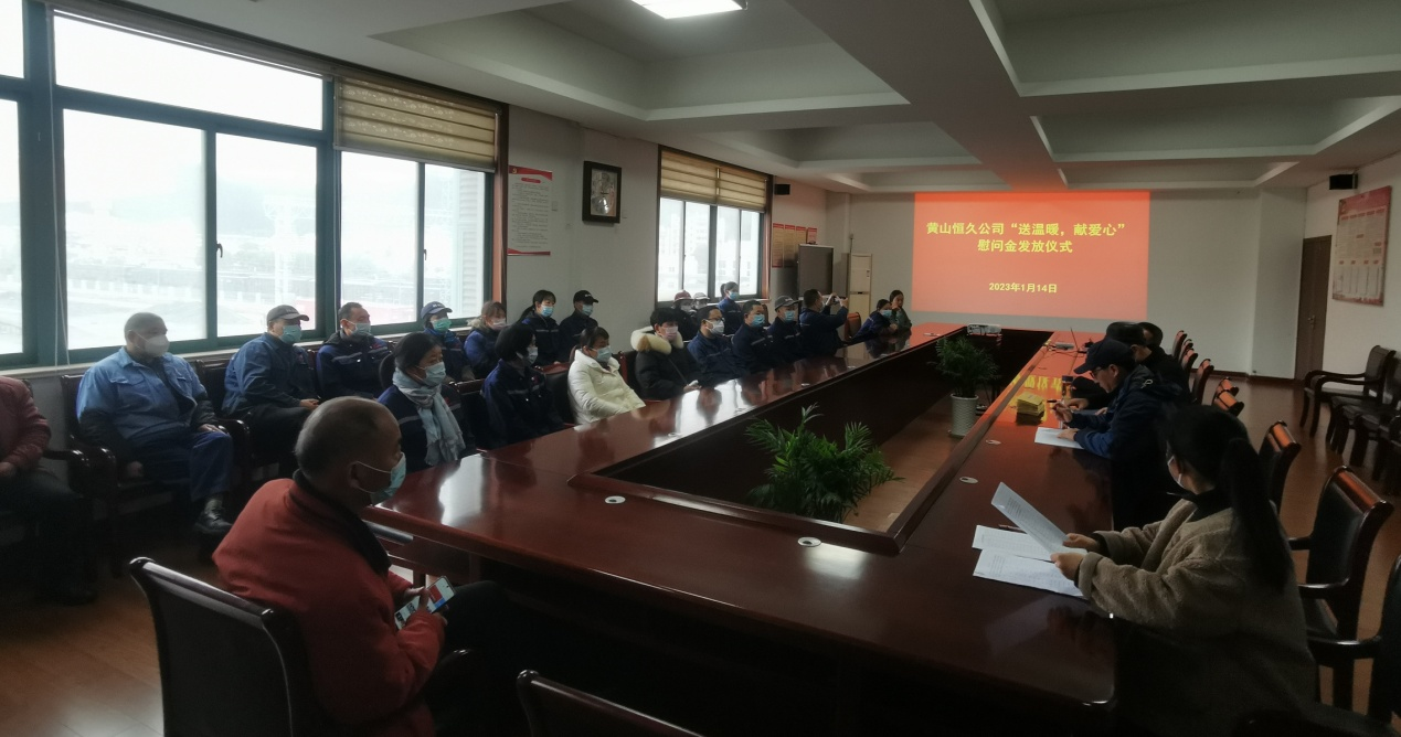 1月14日下午,黄山恒久二楼大会议室暖意洋洋,公司在这里举行2022年度困难职工慰问金发放仪式, 39名困难职工从陈亦兵总经理等领导手中接过慰问金,增添了和谐与欢乐。