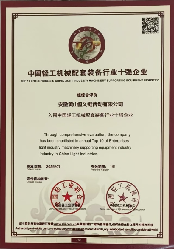 此次入选行业十强,不仅是对黄山恒久综合实力的充分肯定,更进一步提升了黄山恒久在全国轻工装备领域的影响力。未来,黄山恒久将继续坚持“以质量经营品牌、以诚信经营企业”的发展理念,致力于打造国际一流的链传动解决方案供应商,为中国轻工机械产业链的升级与高质量发展贡献更大力量。