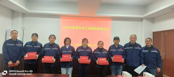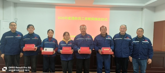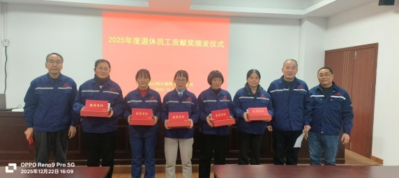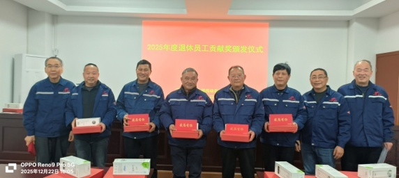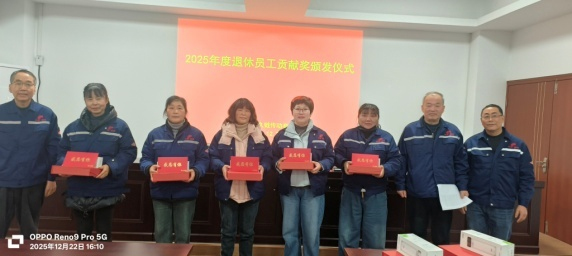冬日暖阳,关怀暖心。为向为企业发展奉献青春年华和智慧的退休职工表达敬意与感谢,让退休职工感受到公司的关怀与尊重,12月22日下午,公司在三楼会议室为2025年光荣退休员工举行了贡献奖颁发仪式。
